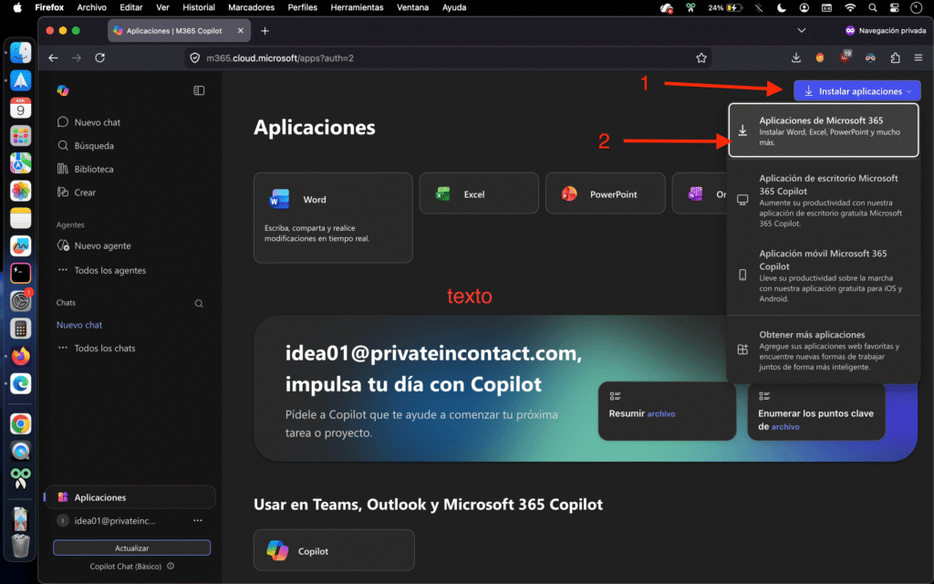 - Vaya a https://m365.cloud.microsoft/apps , clic en el boton azul «Instalar aplicaciones» y luego «Aplicaciones de Microsoft 364»