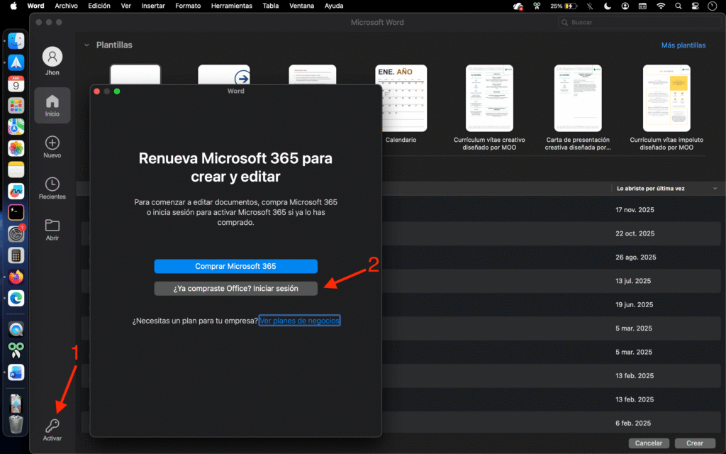 3. Abra cualquier programa de Office (word, excel, etc) y en la parte inferior clic en «Activar» y luego clic en «¿Ya compraste Office? Iniciar sesión»